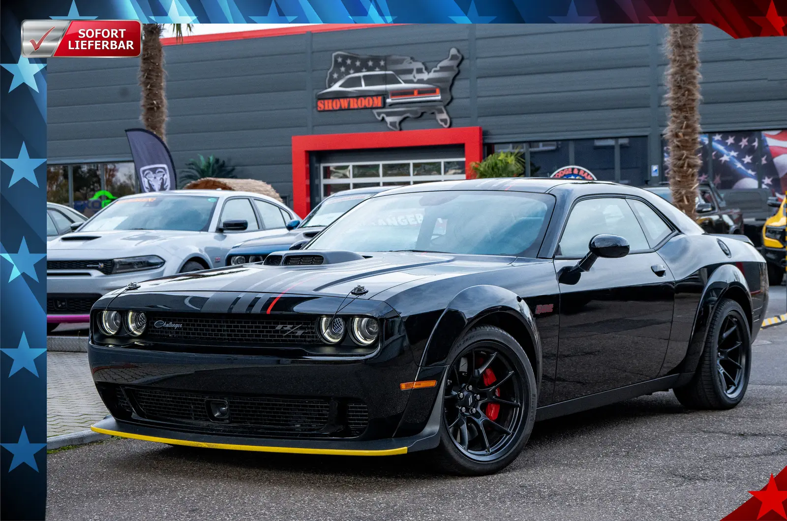Der neue Dodge Challenger 6,4l Scatpack Widebody Shakedown Call in Pitch Black mit Alcantaraausstattung sowie Abstandstempomat und Totwinkelassistent.